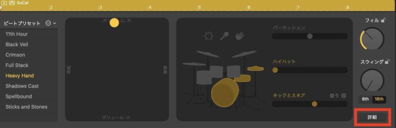 Drummerエディタ右側に『フィル』『スウィング』『8th/16th』『詳細』があります。