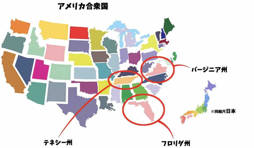 またバージニア州リーズバーグからフロリダ州オーランドまでは車移動で12時間以上と凄まじい時間が掛かります。